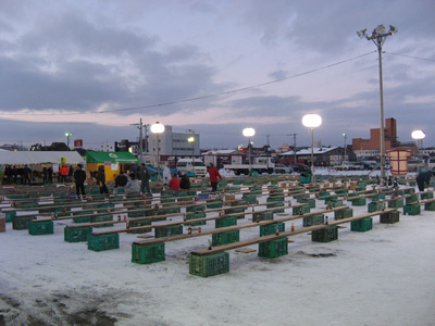 会場は北見駅裏にある「北見芸術⽂化ホール 駐車場特設会場」にて、運営による会場設営にて壮観な客席が設営されています。入場時にチケットと交換に食材を受取り、広大な会場にある自分の席を探します。今回もチケットは Web での販売開始後5分程度で購入完了していましたが、席は会場の中間より後⽅くらいとなっており、商工会議所などでの事前販売が多いのだなと感じました。
